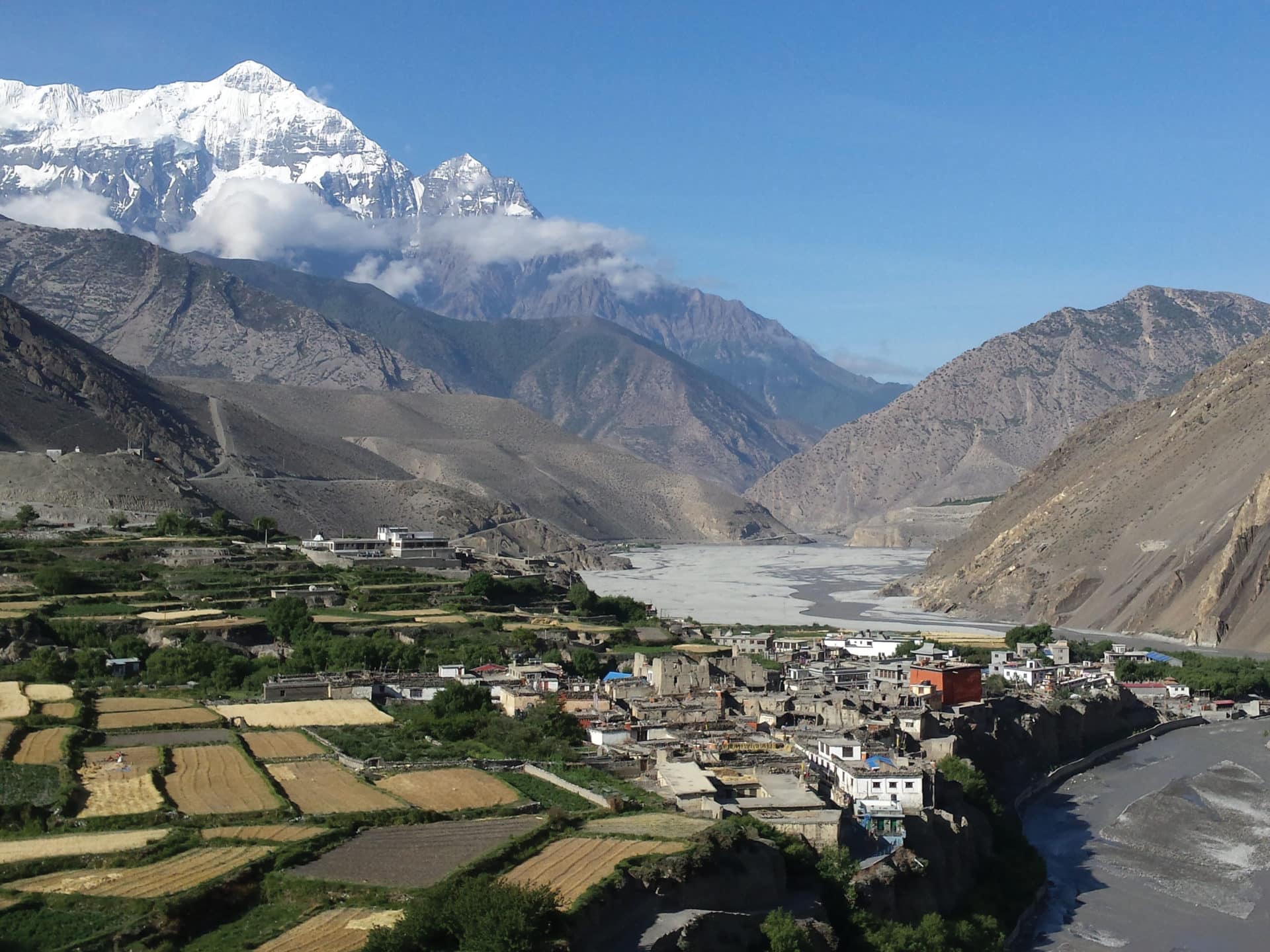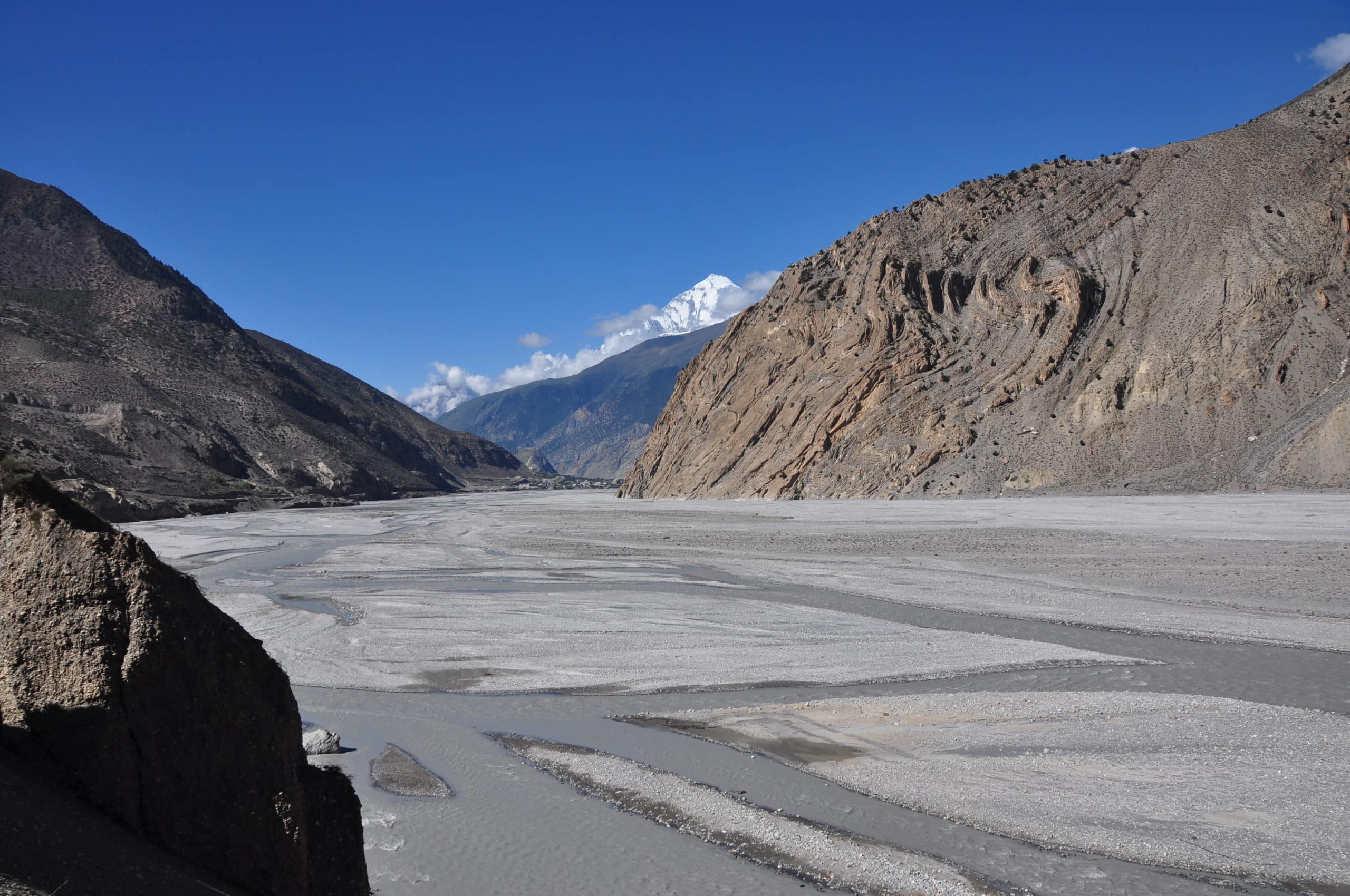 Noch einmal ein Traumblick auf den 8167 m hohen Dhaulagiri, dann beginnt der Abstieg nach Jomsom. In Kagbeni (2800 m) machen wir Stopp, besichtigen eine Gompa und genießen den Blick auf den Tilicho Peak. Dann biegen wir ins windige Kali-Gandaki-Tal ab und folgen dem alten Karawanenweg bis Jomsom. Wenn uns der Sinn danach steht, gehen wir sogar weiter bis nach Marpha (2650 m) und gönnen uns dort einen Ruhetag.