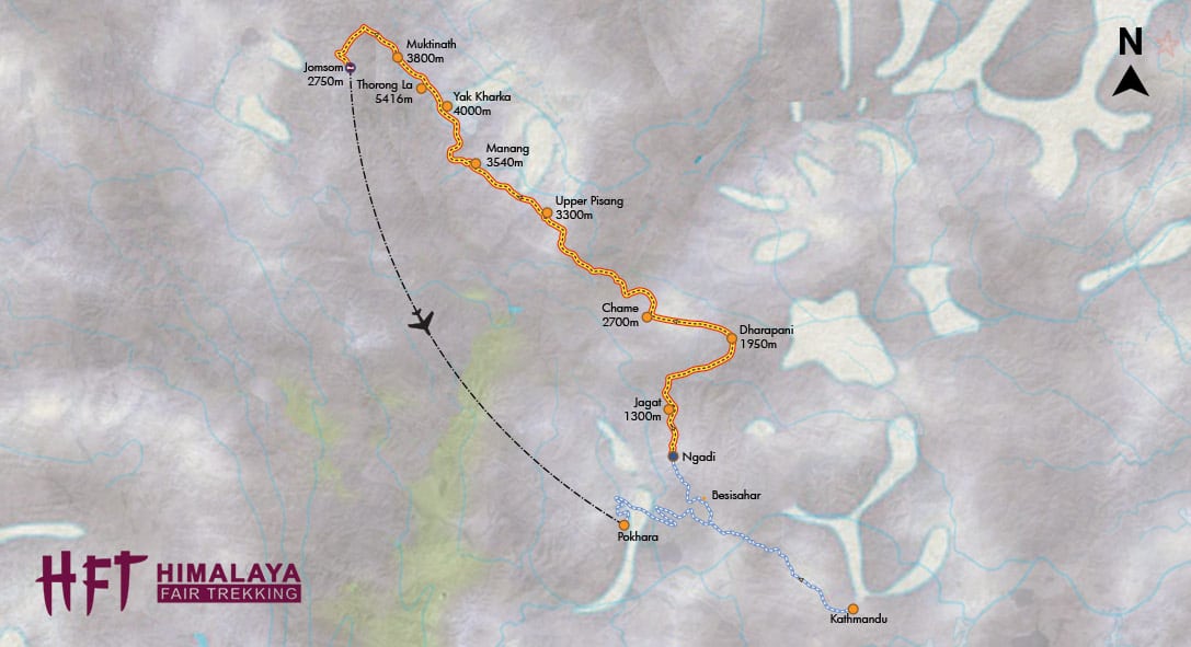 Vom Thorong La steigen wir ab ins Tal des Khali Gandaki, der hier das tiefste Durchbruchstal der Welt ausbildet. Unser Trek führt über den Pilgerort Muktinath nach Jomsom, dem Endpunkt unserer Reise. Von dort fliegen wir vorbei an den 8000ern Annapurna und Dhaulagiri zurück nach Pokhara und weiter nach Kathmandu.