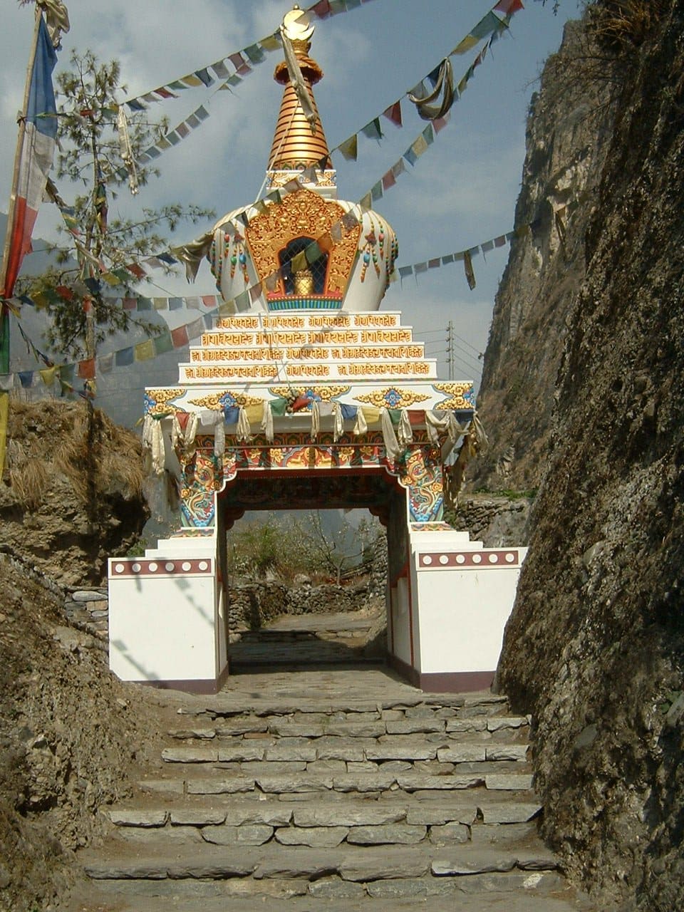 Heute geht's hinauf nach Chame. Das sind nicht nur über 1.000 Höhenmeter, sondern auch einige Kilometer Strecke! Anfangs führt unser Weg durch herrliche Rhododendrenwälder, ein Hochgenuss zur Blütezeit im Frühjahr. Unter anderem kommen wir durch das Örtchen Bagarchap (2160 m), das 1995 von einer Gerölllawine zerstört wurde. An die Opfer, darunter auch einige Trekker, erinnert ein Gedenkstein am Ortseingang.