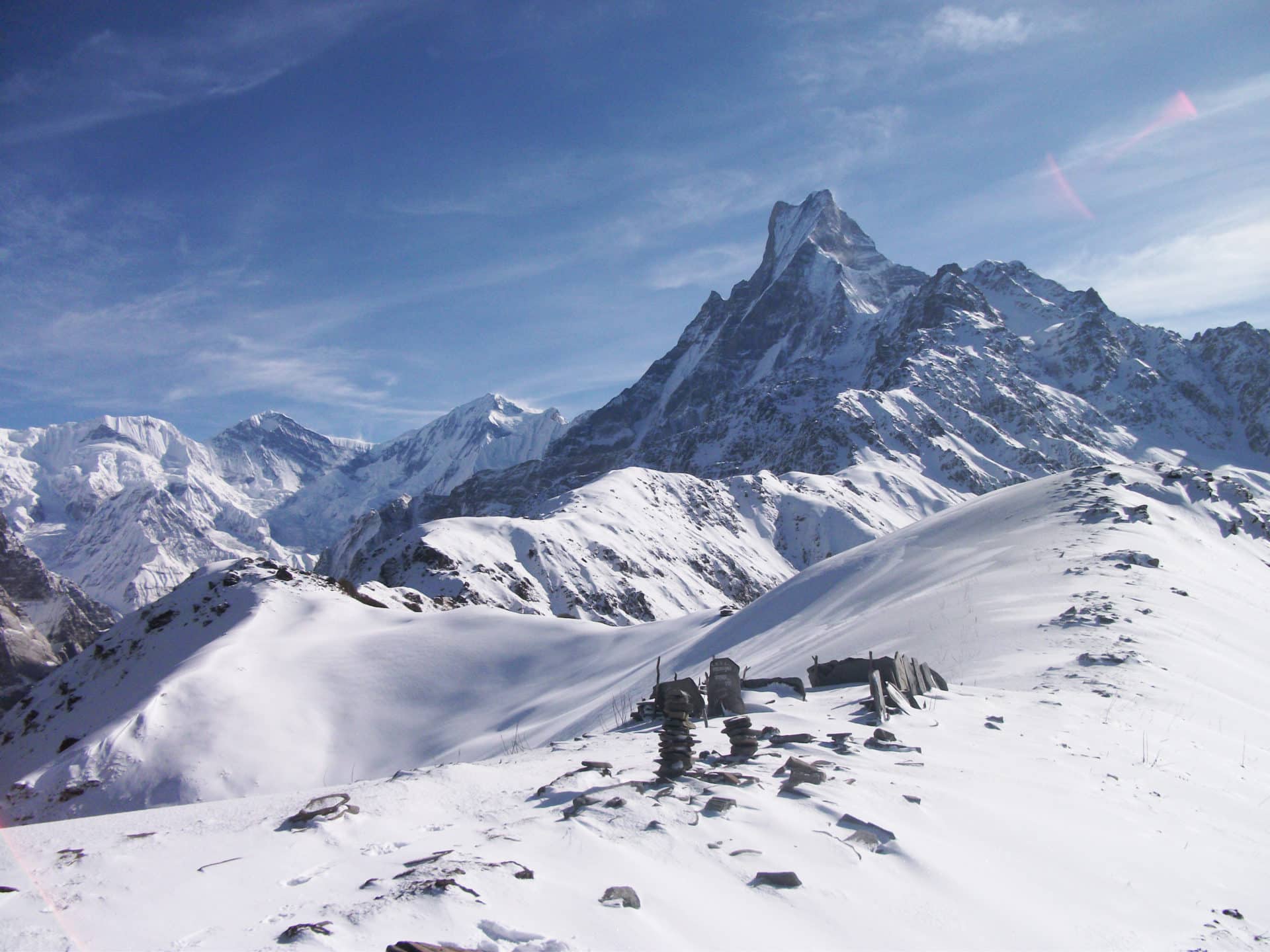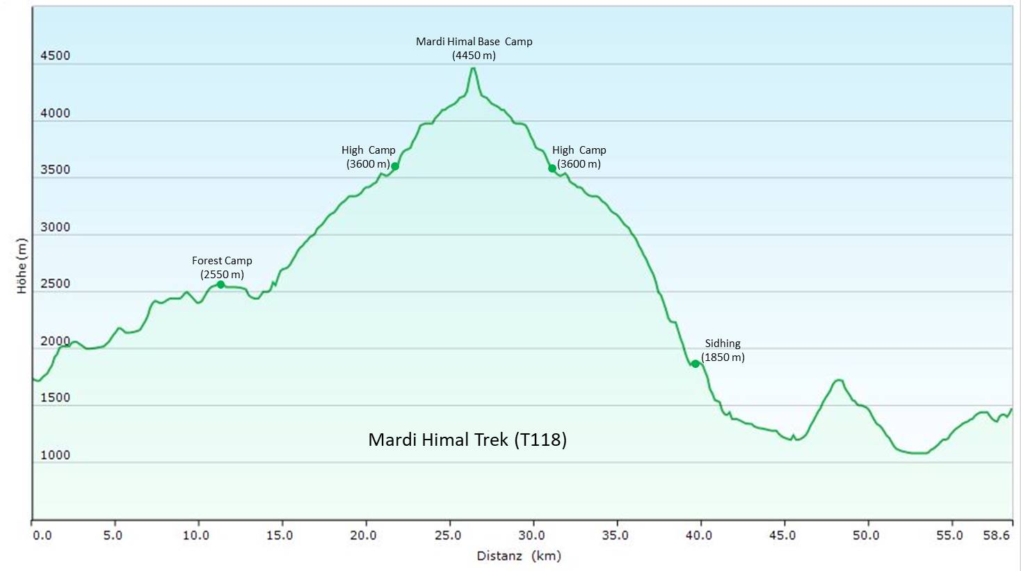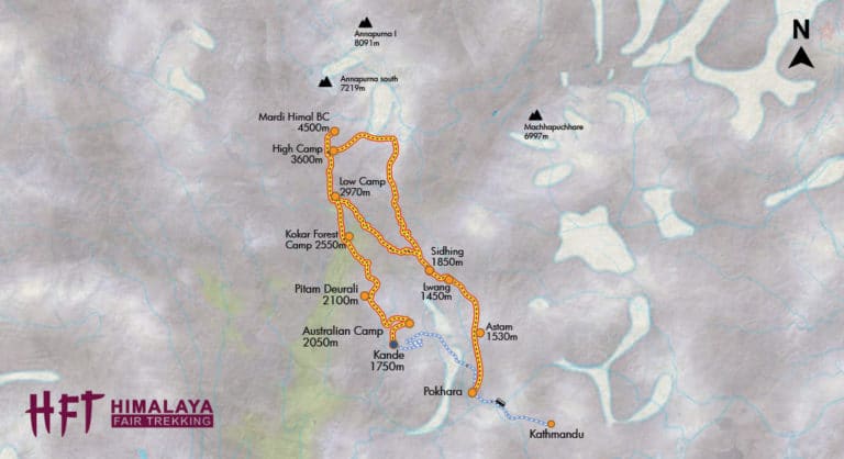 Wir folgen zunächst der frequentierten Route zum Annapurna Base Camp bis Deurali, ab da wird es einsam. Wir übernachten im Forest Camp in Kocar und arbeiten uns über zwei weitere Camps hinauf, vorbei am Upper View Point (4.200 m) zum Mardi Himal Base Camp (4.500 m). Der Weg zum Base Camp erfordert Trittsicherheit und führt zum Teil durch wegloses Gelände. Wer sich das nicht zumuten will, verbringt einen Ruhetag im High Camp.