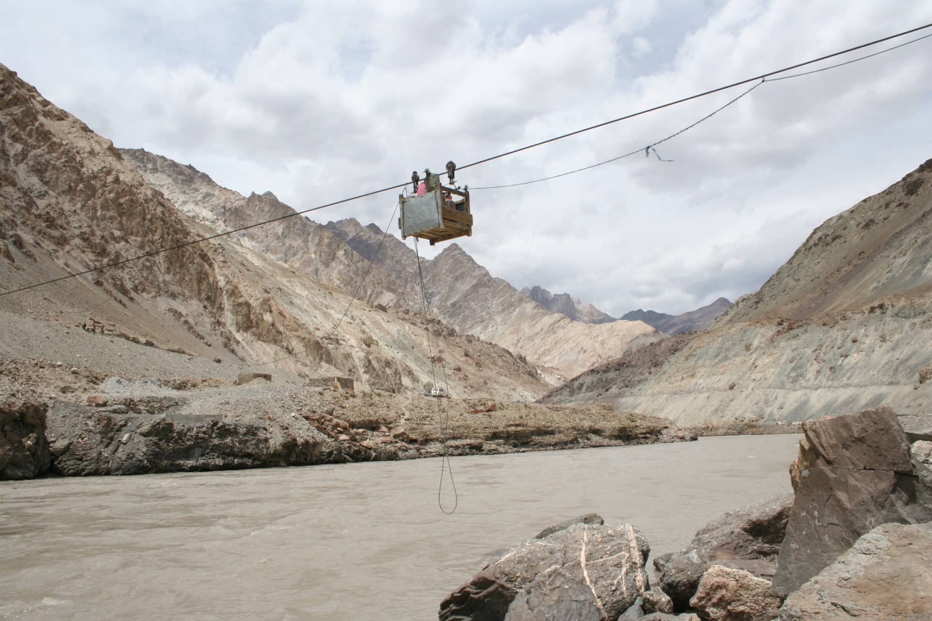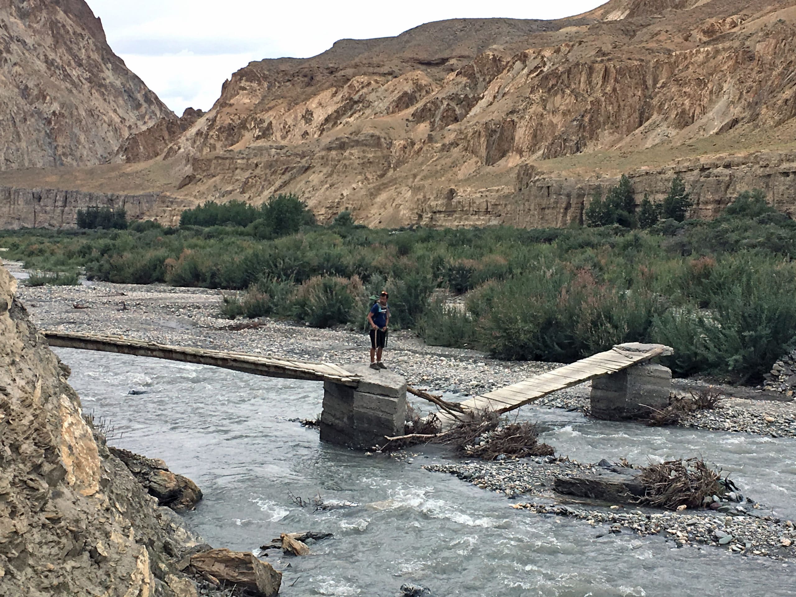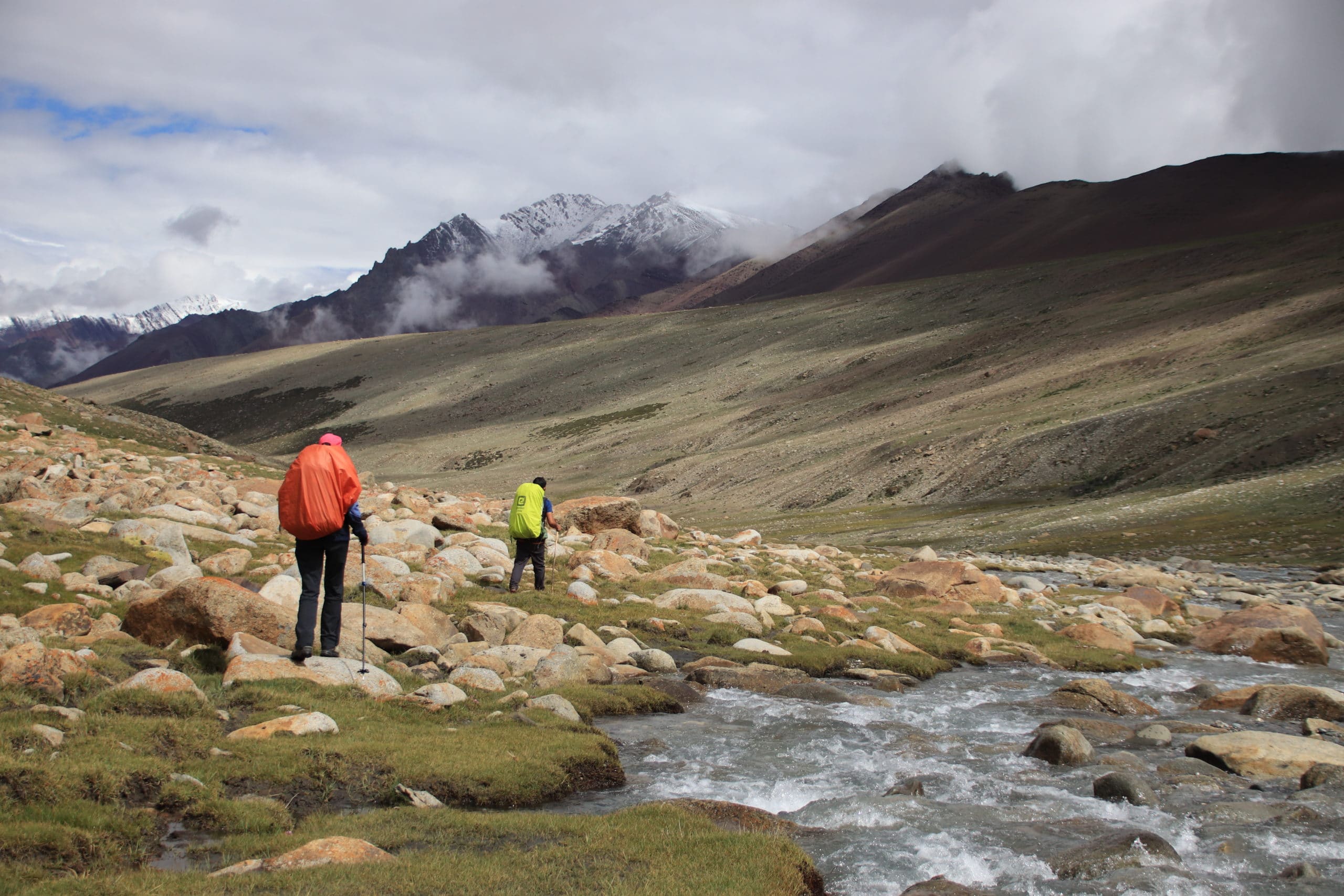 Dann geht es aus dem Indus-Tal zunächst durch grüne Tallandschaft, dann über wilde Schluchten und hohe Pässe hinauf bis zu den 5000 m hoch gelegenen Yak-Weiden von Nimaling. Zahlreiche Flussdurchquerungen sind unvermeidbar und machen den Trek zum Abenteuer. Immer wieder erhaschen wir Blicke auf die Sechstausender Dzo Jongo East Peak (6214 m) (siehe T502) sowie den benachbarten Kang Yatze (6400 m).